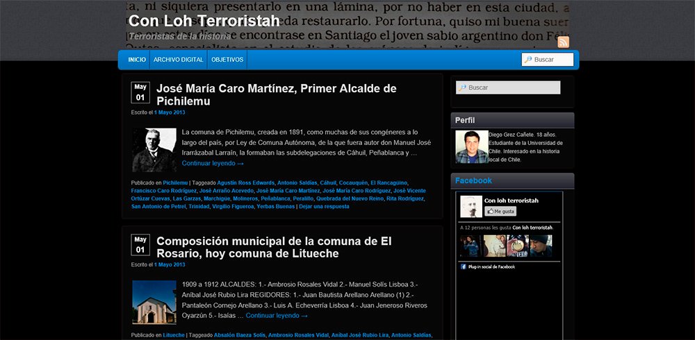 Hace exactos tres años, estaba aburrido en mi pieza de Santiago. Había vendido unas páginas de Facebook en 40 dólares y no podía ocuparlas en otra cosa más que compras en internet, así que se me ocurrió comprar un dominio… «conlohterroristah.com». ¿Qué debe tener…?, pensé. Le implementé WordPress y quedó funcionando como una especie de blog con documentos históricos sobre Pichilemu.