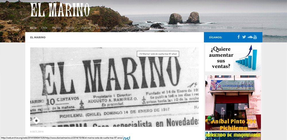 Por lo poco serio del nombre, al tiempo se llamó «Memoria Pichilemina», y así logró «pegar». Con miles de visitas en sólo un par de meses, además de las crónicas históricas le fui añadiendo noticias… y en septiembre de 2014 se hizo necesario cambiarle el nombre una vez más. No había plata, pero unos comerciantes me ayudaron a pagar el nuevo dominio y el hosting de lo que se denominaría «El Marino», nombrado así en honor a un antiguo periódico local (de 1917).